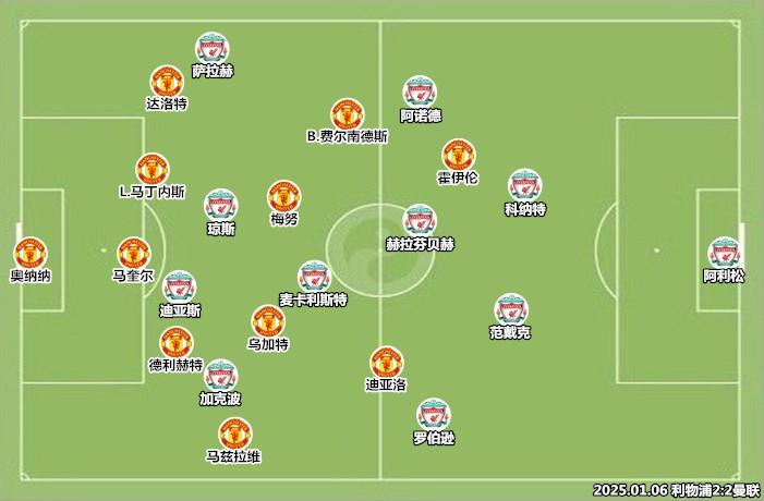 凭借主场之利,利物浦率先发难,赫拉芬贝赫和萨拉赫送出妙传,加克波与麦卡利斯特获得直面奥纳纳的机会。曼联的3421阵型在防守中呈5-4-1/5-2-2-1站位,当利物浦的两名边卫深度参与进攻时,中路的力量对比就会发生严重倾斜,麦卡利斯特和赫拉芬贝赫都可以在相当靠前的位置参与进攻,杀机由此而来。