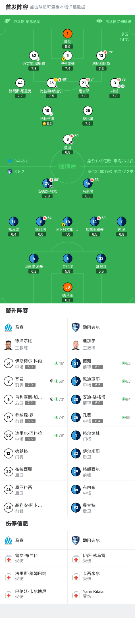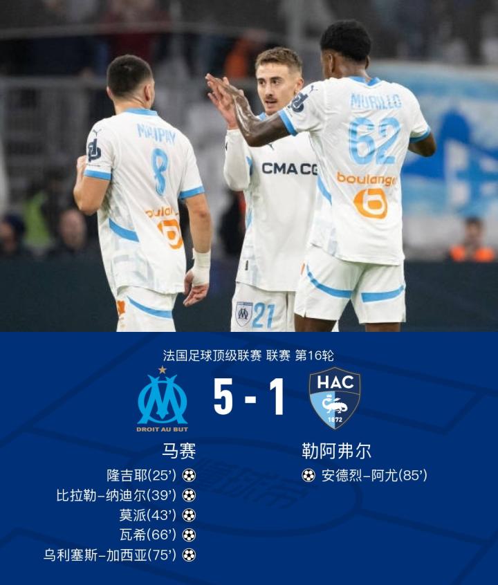 马赛5-1大胜勒阿弗尔,梅兰两助攻,隆吉耶、安德烈-阿尤破门