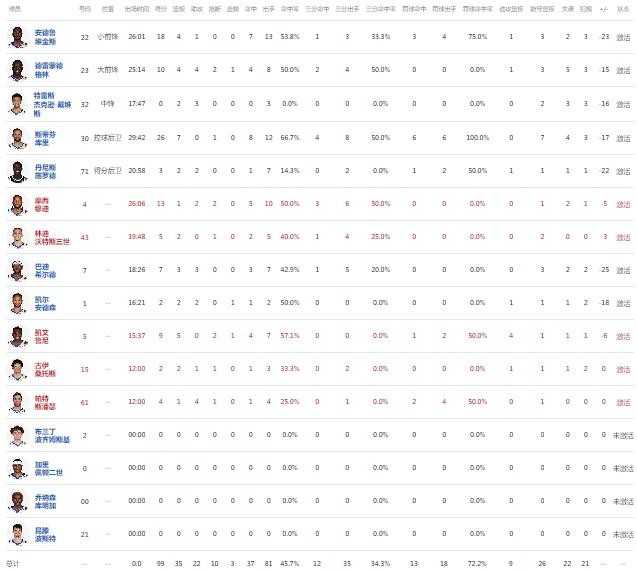 萨克拉门托国王蒙克26分3板12助4断1帽,萨博尼斯22分13板7助,赫尔特16分1板2断。