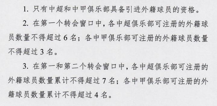 2.在第一和第二个转会窗口中,各中超俱乐部可注册的外籍球员数量累计不得超过6名;各中甲俱乐部可注册的外籍球员数量累计不得超过4名。