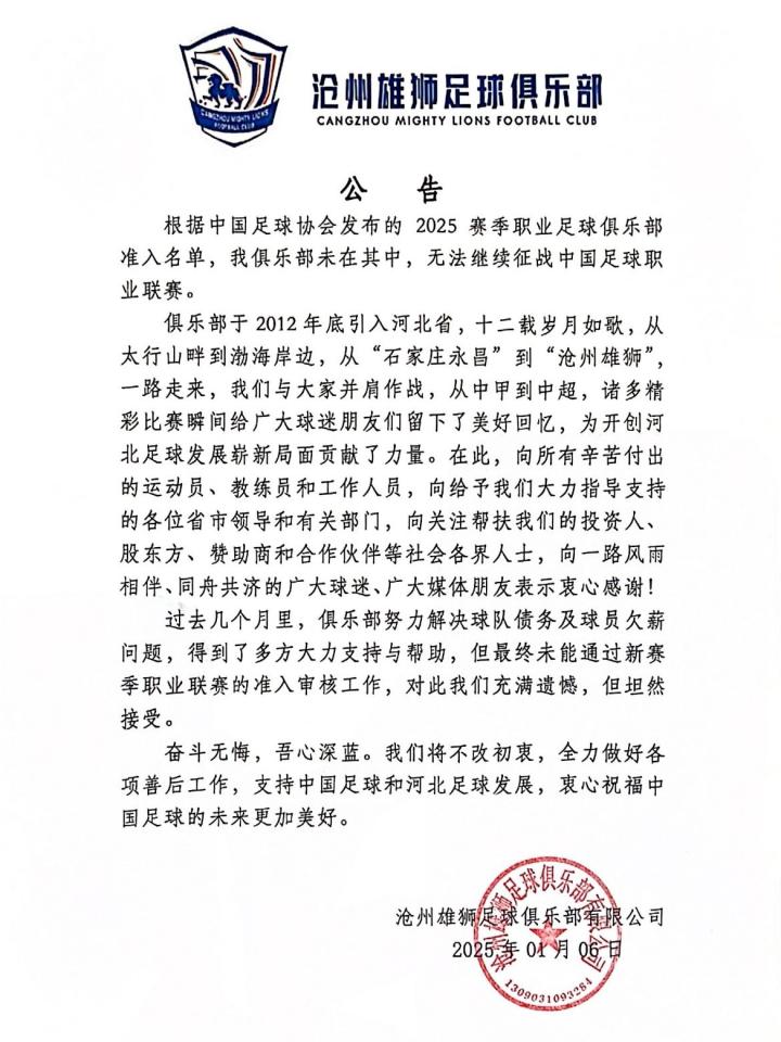 随后,沧州雄狮官方发布公告,宣布俱乐部无法继续参加中国足球职业联赛。