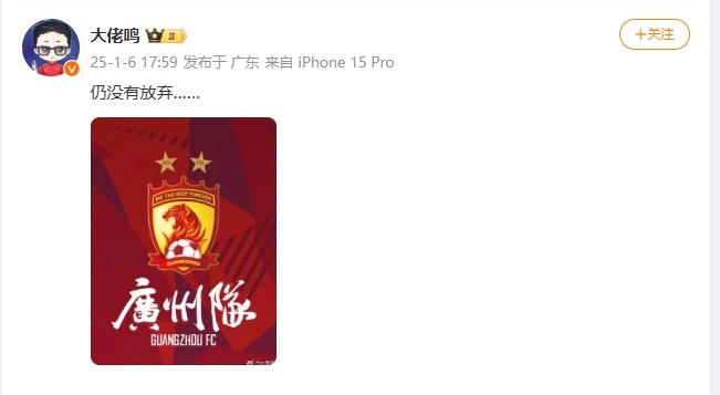 还有转机?博主:广州队仍没有放弃 盖坦9 @懂球帝2025-01-06 18:15北京时间1月6日,中国足协官方公布2025赛季职业联赛准入资格,广州队未在列。博主“大佬鸣”表示目前广州队仍未放弃。大佬鸣在微博中晒出一张广州队的队徽图片,并配文“仍没有放弃…… ”。在足协公布了准入名单后,未过准入的沧州雄狮和湖南湘涛都已官方发布公告,而广州队目前没有发布任何公告。相关阅读足协官方:49家俱乐部获得准入;沧州、广州、湖南湘涛未在列展开更多