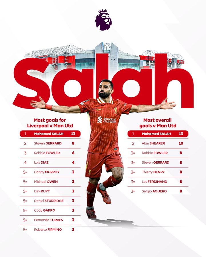 根据统计,萨拉赫在英超当中已经对曼联打进了13个进球,是利物浦队史对曼联进球最多的球员。同时,他还是英超历史当中对曼联进球最多的球员。