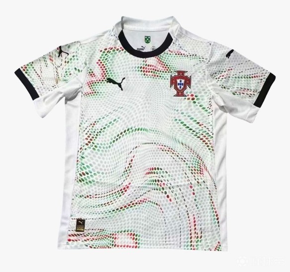 客场球衣采用灰白色底色,点缀红色和绿色细节,精致的徽章图案得以延续,确保与主场球衣的视觉一致性,这种设计在保持简约美感的同时,也向葡萄牙国旗致敬。