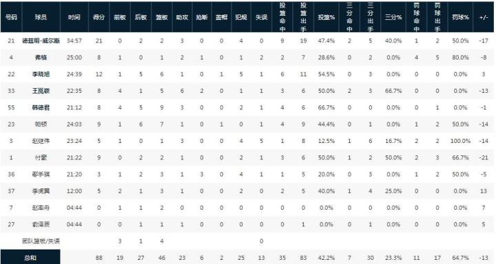 辽宁本钢德兹明-威尔斯21分2板3助,李晓旭12分6板1助,赵继伟赵继伟8中1得5分3助5失误;