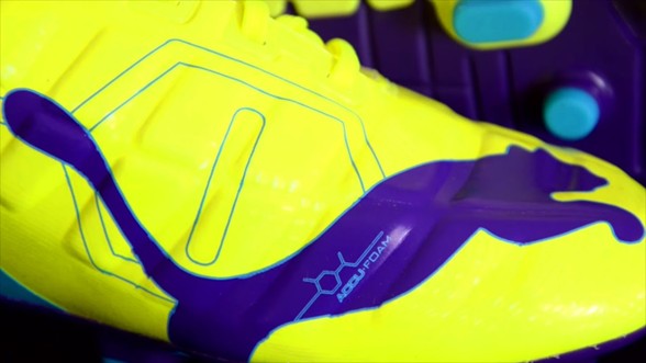 具体来说,Accu-Form面料使得球鞋在传接球时呈现出柔软的形态,使得传接球更舒适稳定,容易掌控球的方向以及增加回旋;而大力射门时则能瞬间变得硬实,让飞出去的皮球更迅猛,并且有着不逊于Nike T90一样的精确度。可以说Accu-Form立体高密度慢回弹海绵无疑是evoPower 1.0球鞋真正的性能体现,而她和表面Adap-Lite超软人造材料的结合更可以说是天造地设。Puma evoPower足球鞋在保证球鞋极致柔软触感的同时,鞋面超强回弹的海绵可以依靠形变来提升射门和出球的精准度,作为力量系球鞋的设计理念,在当时看来确实很新颖。
