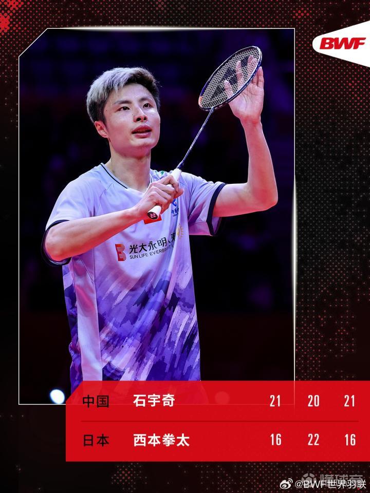 首局比赛,石宇奇率先占据主动,21-16先下一城,次局双方陷入鏖战,西本拳太22-20扳平比分。决胜局,石宇奇没有再给对手机会,21-16,石宇奇击败对手顺利晋级。