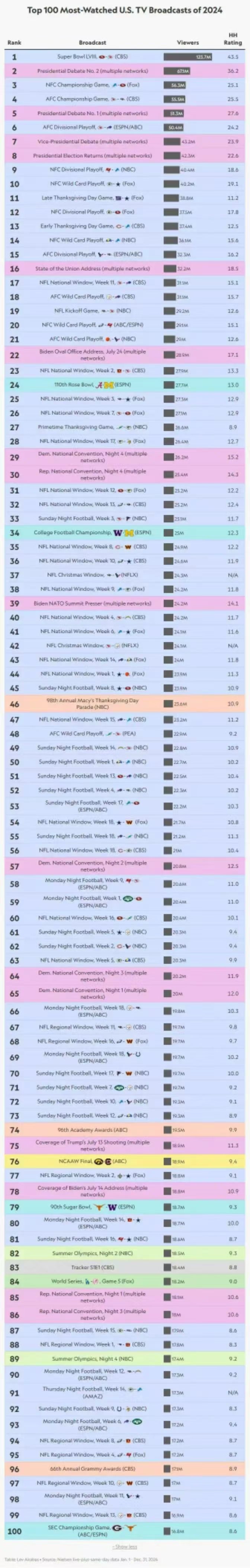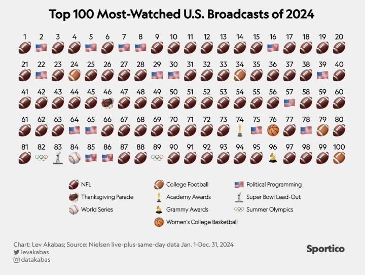 在前100中,橄榄球占到76个席位,而NFL的比赛就占了72个,以绝对的优势再次霸榜。唯一上榜的篮球赛事为目前效力于WNBA印第安纳狂热队的女篮球星凯特琳-克拉克的NCAA最后一战。位列第76位。