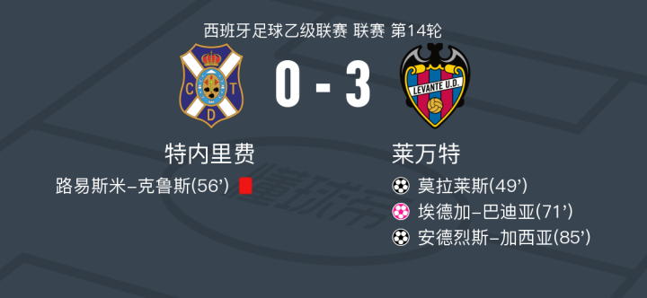 北京时间1月8日西班牙足球乙级联赛 联赛 第14轮,特内里费主场对阵莱万特。特内里费埃德加-巴迪亚自摆乌龙。莱万特莫拉莱斯破门,安德烈斯-加西亚破门。最终比分特内里费 0-3 莱万特。
