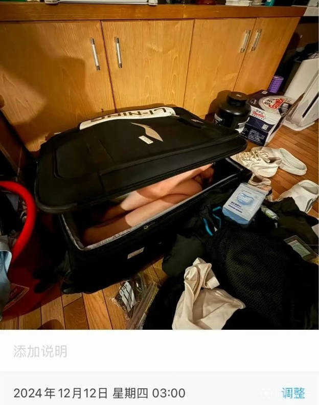 网传张兴亮在12月将女友装进行李箱带回宿舍的照片。
