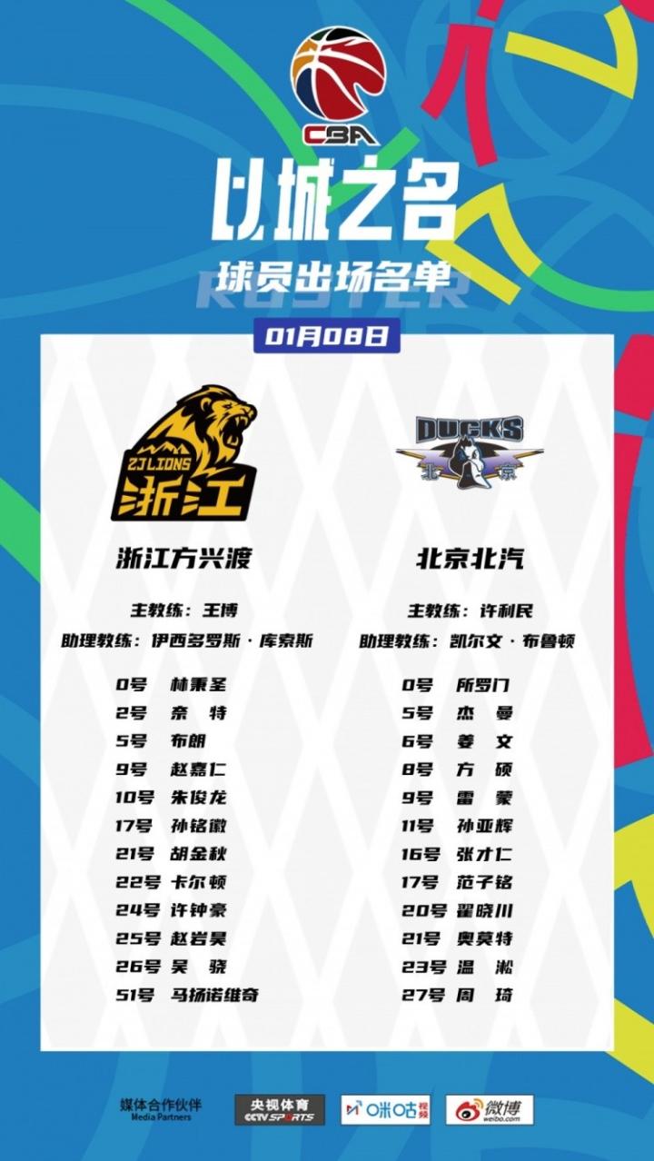 广厦vs北京大名单:博班有望迎首秀,周琦、胡金秋出战