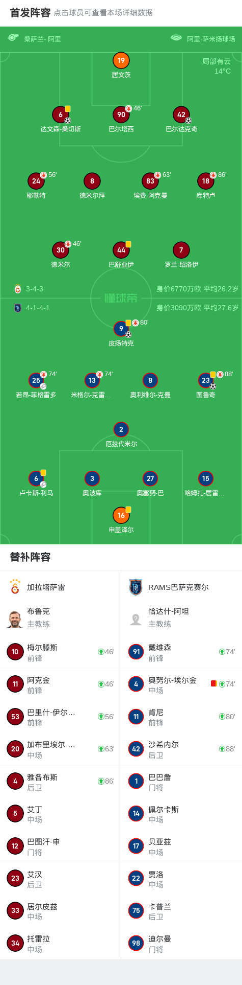 加拉塔萨雷2-2RAMS巴萨克赛尔,达文森破门,巴舒亚伊丢点