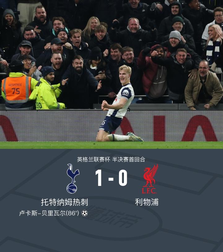 在英格兰联赛杯半决赛首回合的较量中,托特纳姆热刺迎战利物浦。上半场本坦库尔、夸安萨伤退,阿利松救险下半场德拉古辛门线解围,索兰克破门被吹越位,贝里瓦尔低射破门。最终,托特纳姆热刺以1-0战胜利物浦,取得了比赛的胜利。