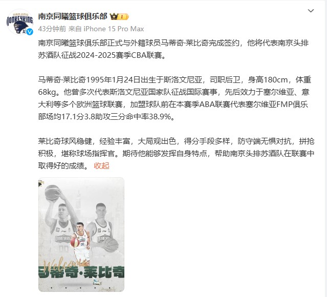 南京同曦篮球俱乐部官方:马蒂奇-莱比奇正式完成签约