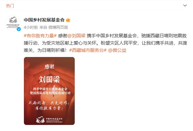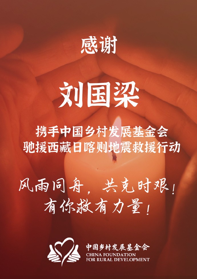 中国乡村发展基金会官方写道:感谢刘国梁携手中国乡村发展基金会,驰援西藏日喀则地震救援行动,为受灾地区献上爱心与关怀。盼望灾区人民平安,让我们携手共进,共渡难关,为日喀则祈福!