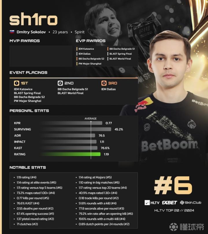 23岁的俄罗斯狙击手Dmitry “sh1ro” Sokolov成功当选2024年度TOP6,连续第4年进入TOP20榜单(21年TOP4、22年TOP3、23年TOP8)。sh1ro和Spirit经历了跌宕起伏的一年,在开季和收官阶段打出了巅峰表现,获得IEM卡托维兹、BLAST春决、BB别墅杯S2、上海Major冠军,以及BB别墅杯S1、BLAST世决亚军,sh1ro本人也凭借稳定的表现拿下7个EVP。