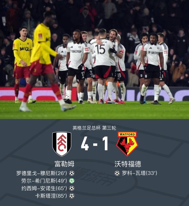 北京时间1月10日英格兰足总杯 第三轮,富勒姆对阵沃特福德。富勒姆罗德里戈-穆尼斯破门,约西姆-安诺生破门,卡斯塔涅破门,劳尔-希门尼斯破门。沃特福德罗科-瓦塔破门。最终比分富勒姆 4-1 沃特福德。