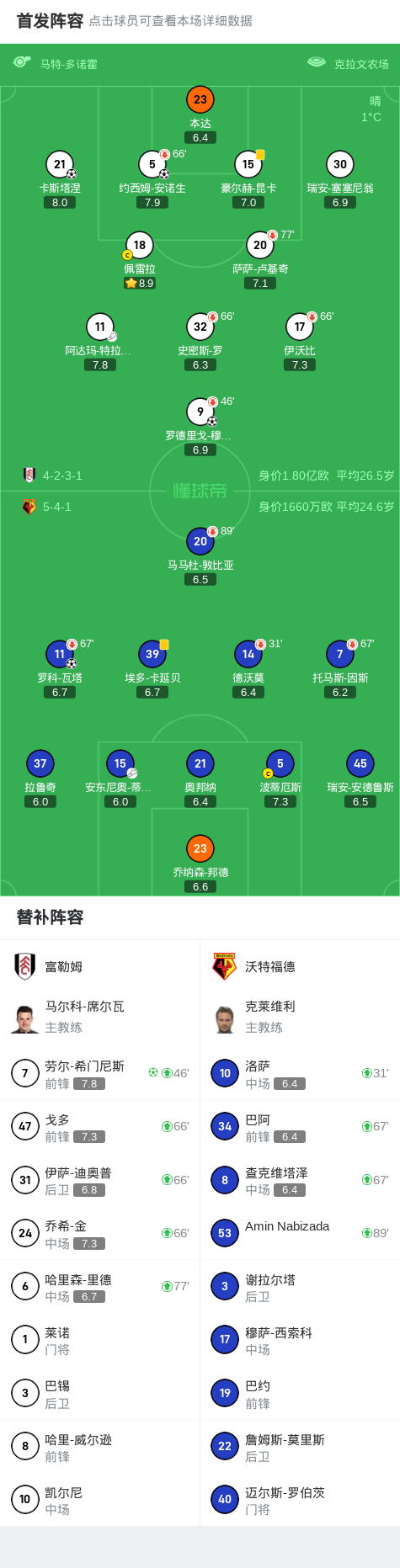 富勒姆4-1沃特福德,希门尼斯点射,穆尼斯、安诺生、卡斯塔涅破门