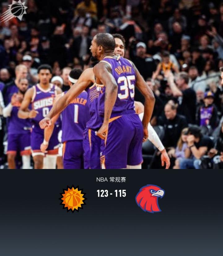 第四节太阳格雷森-阿伦拿下10分,老鹰亨特拿下10分,最终太阳123-115战胜老鹰