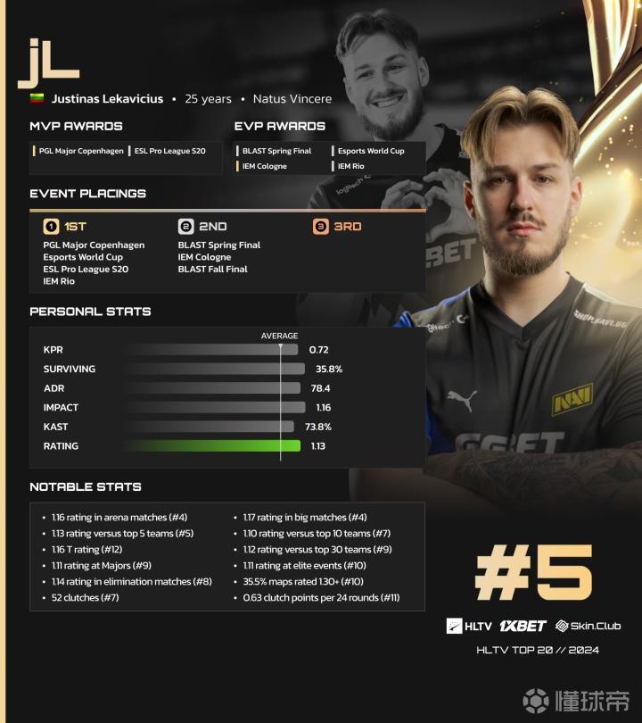 来自NAVI的25岁立陶宛选手Justinas “jL” Lekavicius职业生涯首次入选TOP榜单就获评TOP5,加入天生赢家后成为队内稳定的一环,全年帮助队伍拿下4冠3亚,自己也收获了2次MVP与4次EVP。