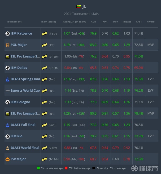 数据方面,jL平均Rating1.13,场馆赛事Rating1.16,重大比赛Rating1.17,面对TOP5战队Rating1.13,面对TOP10战队Rating1.10,面对TOP30战队Rating1.12,Major赛事Rating1.11,精英赛事Rating1.11,淘汰赛事Rating1.14,是当之无愧的大场面先生。