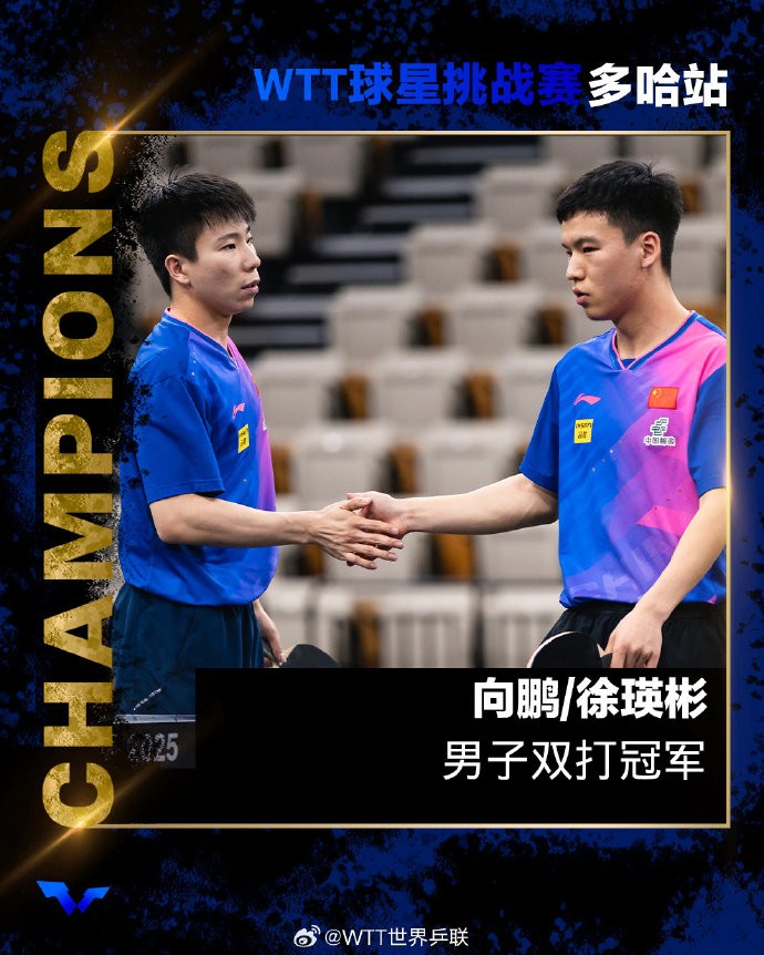向鹏/徐瑛彬3-2张本智和组合,夺WTT球星挑战赛多哈站男双冠军我的靴子里面有蛇 @懂球帝2025-01-11 01:57北京时间1月11日,WTT球星挑战赛多哈站男双决赛,中国组合向鹏/徐瑛彬3-2击败日本组合张本智和/松岛辉空,获得冠军。第一局,中国组合10-6领先浪费4个局点,最终15-13险胜。第二局,日本组合11-4快速扳回一局。第三局,中国组合顶住对手的反扑,11-8再次取得领先。第四局,中国组合浪费赛点,日本组合13-11将比赛拖入决胜局。决胜局,中国组合11-6取胜,拿到冠军。展开更多