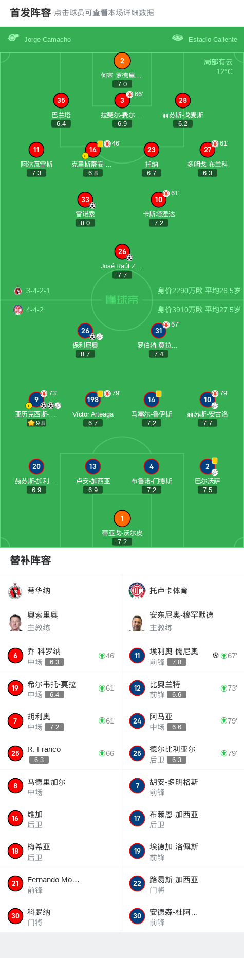 托卢卡体育4-2蒂华纳,亚历克西斯-维加两球,保利尼奥1射1传