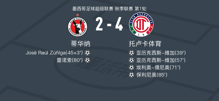 北京时间1月11日墨西哥足球超级联赛 秋季联赛 第1轮,蒂华纳主场对阵托卢卡体育。蒂华纳José Raúl Zúñiga破门,雷诺索破门。托卢卡体育亚历克西斯-维加梅开二度,埃利奥-儒尼奥破门,保利尼奥破门。最终比分蒂华纳 2-4 托卢卡体育。