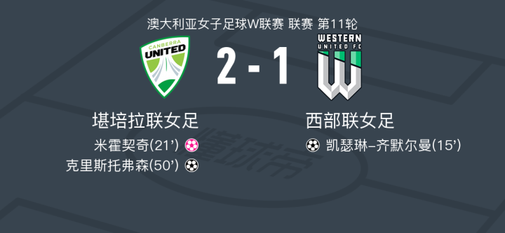 北京时间1月11日澳大利亚女子足球W联赛 联赛 第11轮,堪培拉联女足主场对阵西部联女足。堪培拉联女足克里斯托弗森破门。西部联女足凯瑟琳-齐默尔曼破门,米霍契奇自摆乌龙。最终比分堪培拉联女足 2-1 西部联女足。