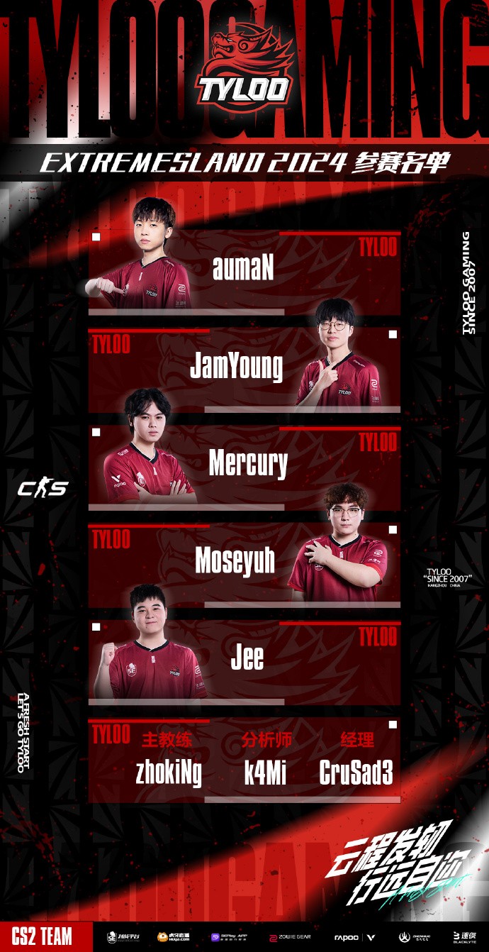 TYLOO电子竞技俱乐部CS2分部选手aumaN,Mercury,Moseyuh,JamYoung,Jee将携手出战eXTREMESLAND 2024。