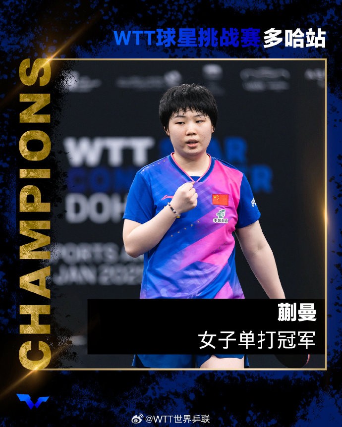 蒯曼4-0轻取木原美悠,夺WTT球星挑战赛多哈站女单冠军我的靴子里面有蛇 @懂球帝2025-01-11 21:271月11日,WTT球星挑战赛多哈站女单决赛,蒯曼4-0击败日本选手木原美悠,赢得冠军。蒯曼一直掌控比赛节奏,只在第三局遇到挑战,最终以11-6、11-3、11-8、11-3轻松赢下对手,拿到冠军,并收获600个积分。本站比赛,国乒获得女单(蒯曼)和男双(向鹏/徐瑛彬)两个冠军,混双(黄友政/石洵瑶)和女双(何卓佳/纵歌曼)获得亚军。展开更多