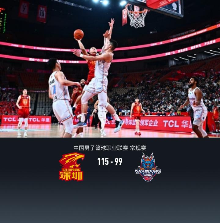 第四节深圳马凯尔-约翰逊拿下9分,山东高诗岩拿下9分,最终深圳115-99战胜山东