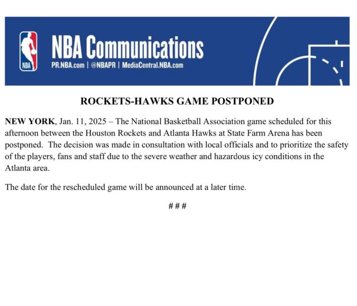 NBA官方:因极端天气,火箭和老鹰的比赛推迟并择日重赛尼古拉约基奇2025-01-11 23:10据NBA官方消息,北京时间明日凌晨4点火箭客战老鹰的比赛因极端恶劣天气宣布推迟。官方表示,在与当地官员协商后,联盟决定推迟本场比赛。目前,亚特兰大当地遭遇了恶劣的低温天气并出现危险的冰冻情况,考虑到球员、球迷和工作人员的安全,这场比赛将择日再战,重赛的日期将在之后公布。近日NBA多场比赛出现推迟的情况,主要原因是因为洛杉矶山火,洛杉矶两支球队湖人和快船的比赛相继推迟。展开更多
