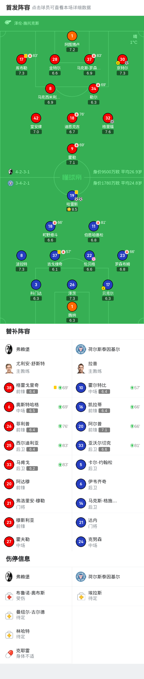 弗赖堡3比2基尔,京特尔打入超级任意球,哈雷斯梅开二度