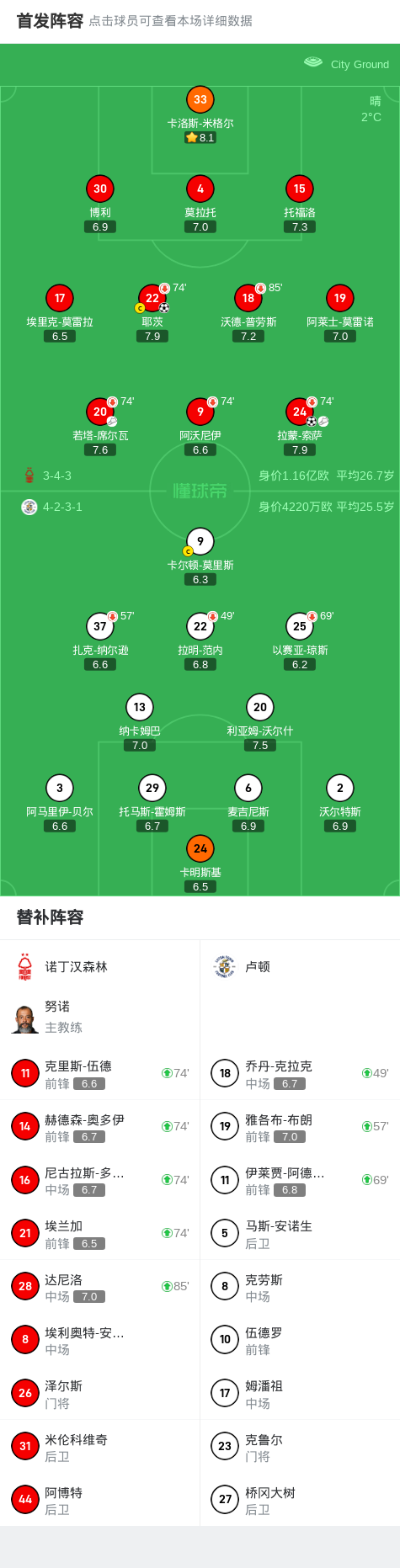 第85分钟,诺丁汉森林换人,达尼洛伤愈登场