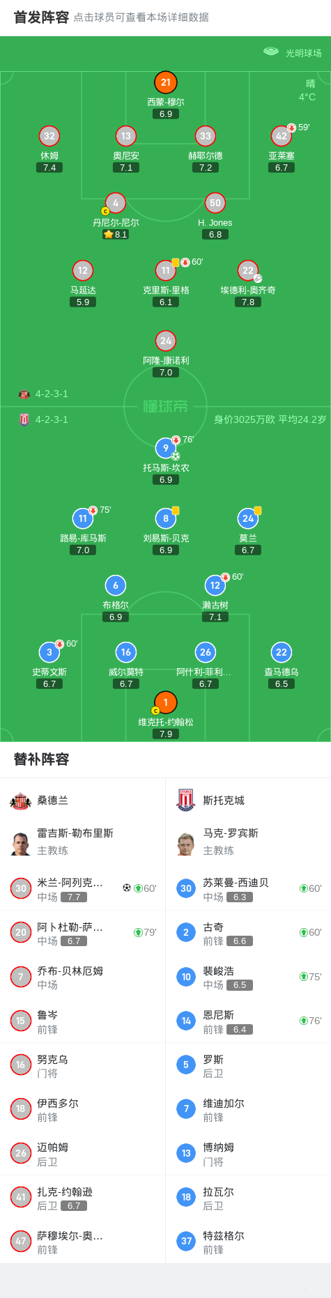 90分钟战报:桑德兰1-1斯托克城,米兰-阿列克西奇救主战报bot @懂球帝2025-01-12 00:57在英格兰足总杯第三轮的较量中,桑德兰迎战斯托克城。比赛中,斯托克城的托马斯-坎农率先通过点球为球队取得领先。随后,桑德兰的埃德利-奥齐奇送出精彩助攻,帮助米兰-阿列克西奇扳平比分。精彩瞬间第4分钟,斯托克城球员托马斯-坎农罚入点球。第64分钟,桑德兰球员埃德利-奥齐奇助攻米兰-阿列克西奇打入一球。球队阵容技术统计展开更多