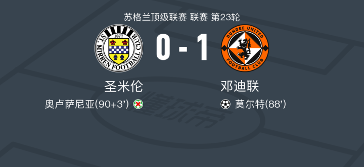 北京时间1月11日苏格兰顶级联赛 联赛 第23轮,圣米伦主场对阵邓迪联。邓迪联莫尔特破门。最终比分圣米伦 0-1 邓迪联。