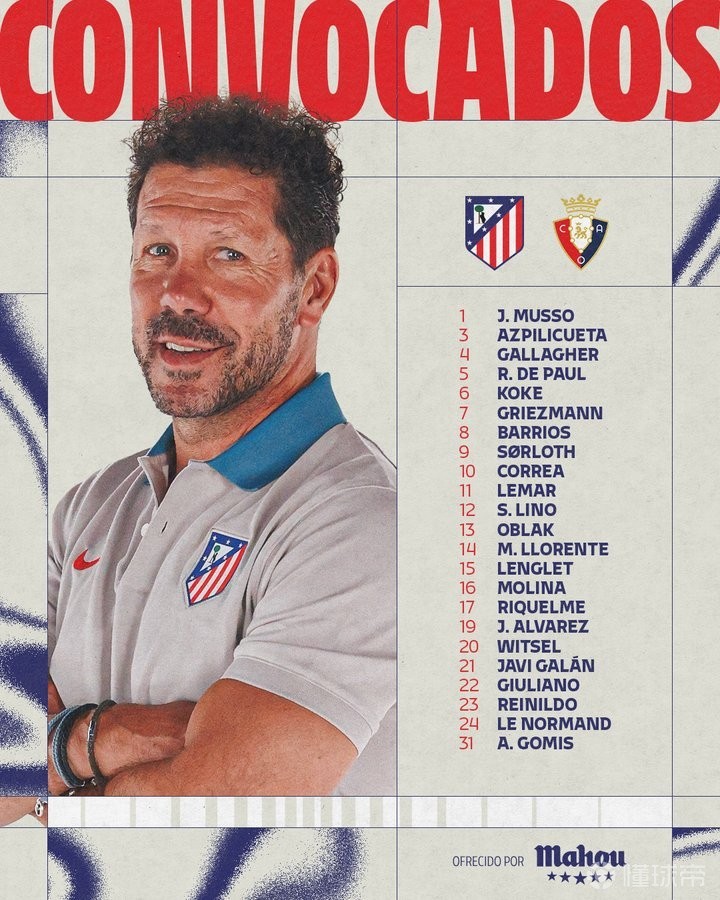 马竞对阵奥萨苏纳大名单:格子领衔,小蜘蛛、朱利亚诺在列