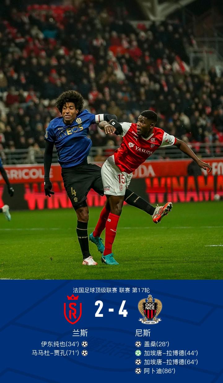 北京时间1月12日法国足球顶级联赛 联赛 第17轮,兰斯主场对阵尼斯。兰斯伊东纯也破门,马马杜-贾孔破门。尼斯盖桑破门,加埃唐-拉博德梅开二度,阿卜迪破门。最终比分兰斯 2-4 尼斯。