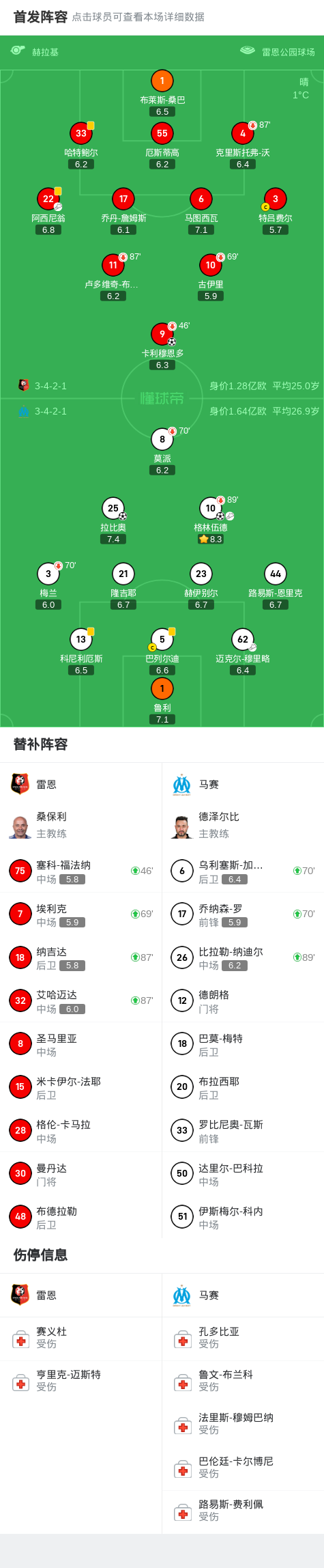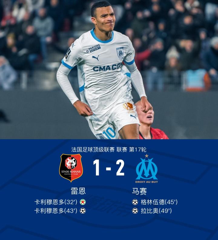 北京时间1月12日法国足球顶级联赛 联赛 第17轮,雷恩主场对阵马赛。雷恩卡利穆恩多破门+失点。马赛格林伍德传射,拉比奥头球吊射制胜。最终比分雷恩 1-2 马赛。