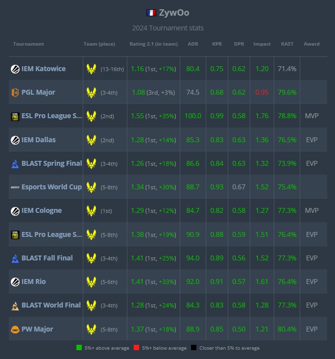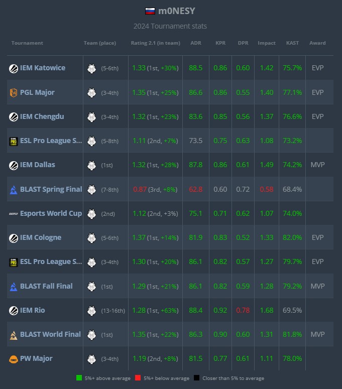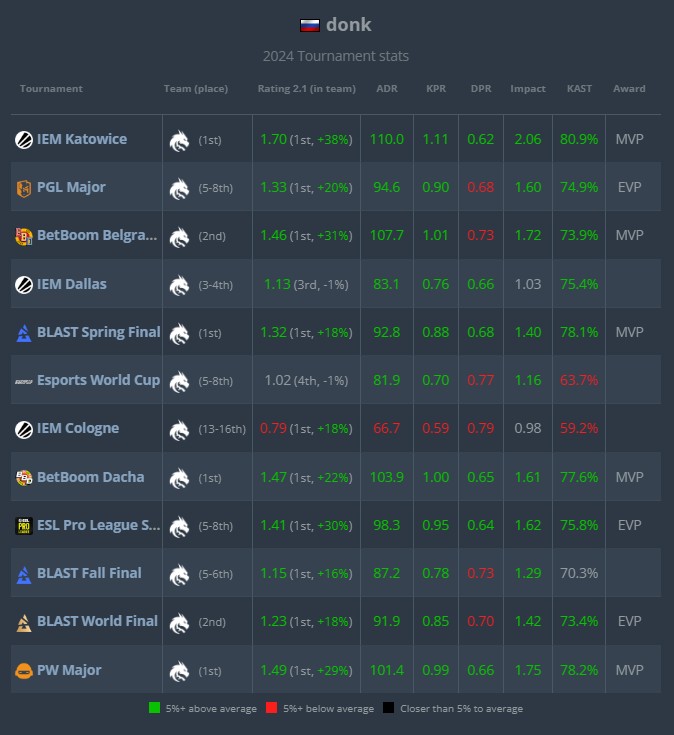 donk在2024年帮助绿龙拿下4个冠军,个人收获5个MVP奖牌外加3次EVP,平均Rating为恐怖的1.36,多项数据位列全部选手首位,成为历史上首位俄罗斯TOP1选手。
