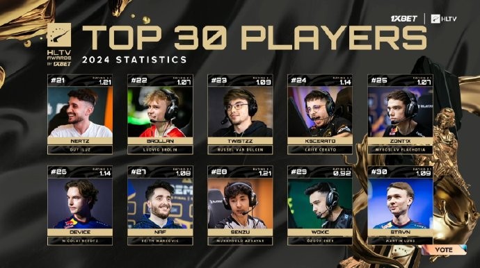 HLTV还公布了TOP21-30位选手,Nertz在2024赛季轰出1.21Rating遗憾未进入前20。