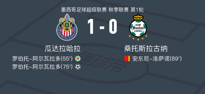 瓜达拉哈拉1-0桑托斯拉古纳,罗伯托-阿尔瓦拉多助球队取胜
