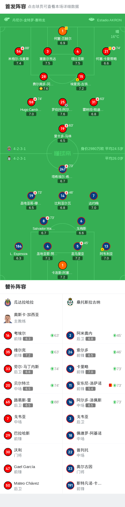第75分钟,瓜达拉哈拉球员维尔克助攻罗伯托-阿尔瓦拉多打入一球。