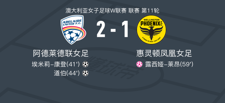 北京时间1月12日澳大利亚女子足球W联赛 联赛 第11轮,阿德莱德联女足主场对阵惠灵顿凤凰女足。阿德莱德联女足埃米莉-康登破门,道伯破门,露西娅-莱昂自摆乌龙。最终比分阿德莱德联女足 2-1 惠灵顿凤凰女足。