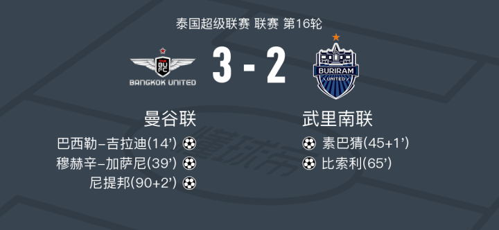 北京时间1月12日泰国超级联赛 联赛 第16轮,曼谷联主场对阵武里南联。曼谷联巴西勒-吉拉迪破门,穆赫辛-加萨尼破门,尼提邦破门。武里南联素巴猜破门,比索利破门。最终比分曼谷联 3-2 武里南联。