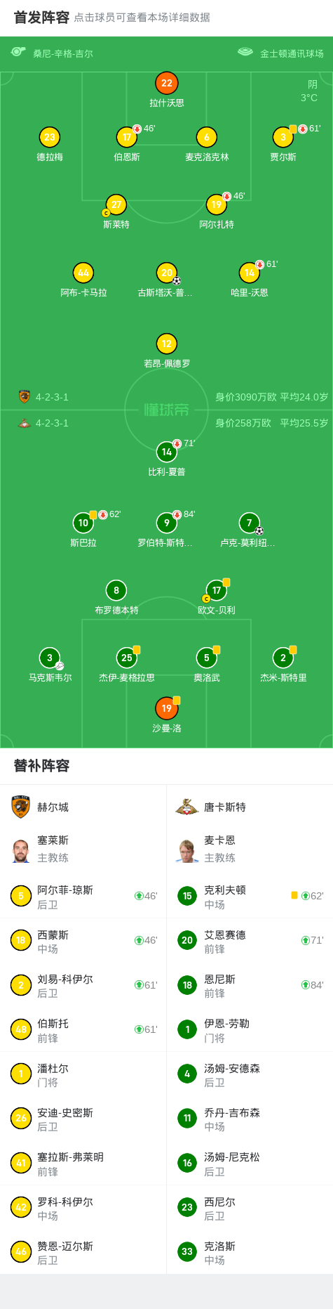 90分钟战报:赫尔城1-1唐卡斯特,莫利纽克斯、普埃尔塔破门战报bot @懂球帝2025-01-12 22:02北京时间1月12日英格兰足总杯 第三轮,赫尔城对阵唐卡斯特。赫尔城古斯塔沃-普埃尔塔破门。唐卡斯特卢克-莫利纽克斯破门。最终比分赫尔城 1-1 唐卡斯特。点击查看本场比赛详细数据>>点击查看足总杯完整积分榜>>精彩瞬间第51分钟,唐卡斯特球员马克斯韦尔助攻卢克-莫利纽克斯打入一球。第80分钟,赫尔城球员古斯塔沃-普埃尔塔打入一球。球队阵容技术统计展开更多