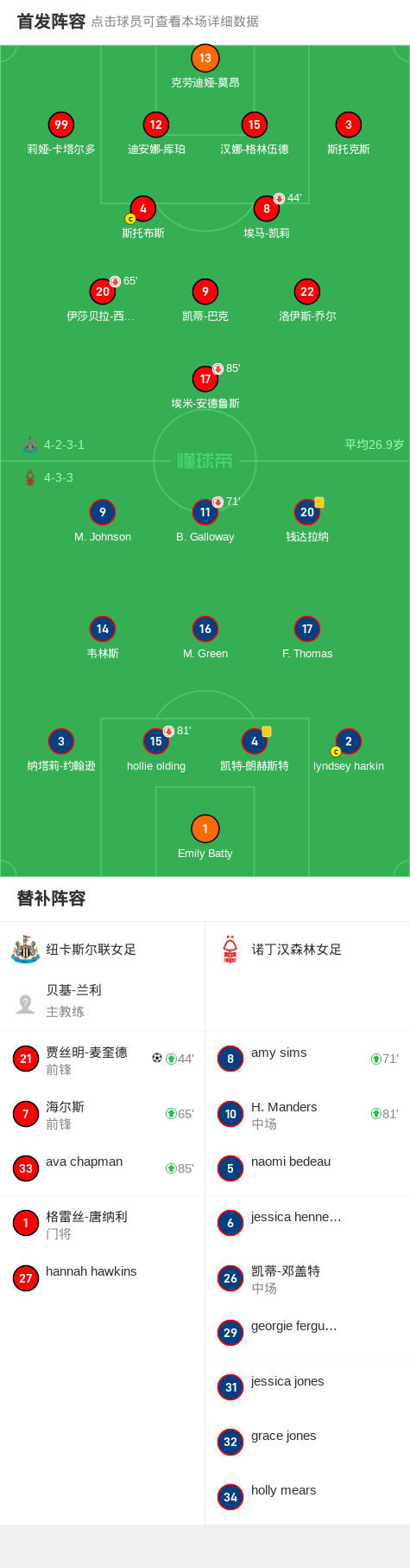 纽卡斯尔联女足1-0诺丁汉森林,贾丝明-麦奎德一锤定音战报bot @懂球帝2025-01-12 23:00北京时间1月12日英格兰女子足总杯 第四轮,纽卡斯尔联女足对阵诺丁汉森林女足。纽卡斯尔联女足贾丝明-麦奎德破门。最终比分纽卡斯尔联女足 1-0 诺丁汉森林。点击查看本场比赛详细数据>>精彩瞬间第76分钟,纽卡斯尔联女足球员贾丝明-麦奎德打入一球。 球队阵容 展开更多
