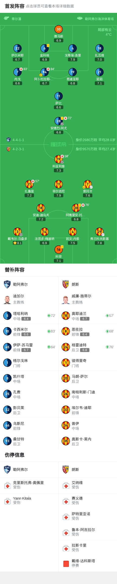 朗斯2-1客场逆转勒阿弗尔,科亚利普破门,戴韦尔-马查多制胜