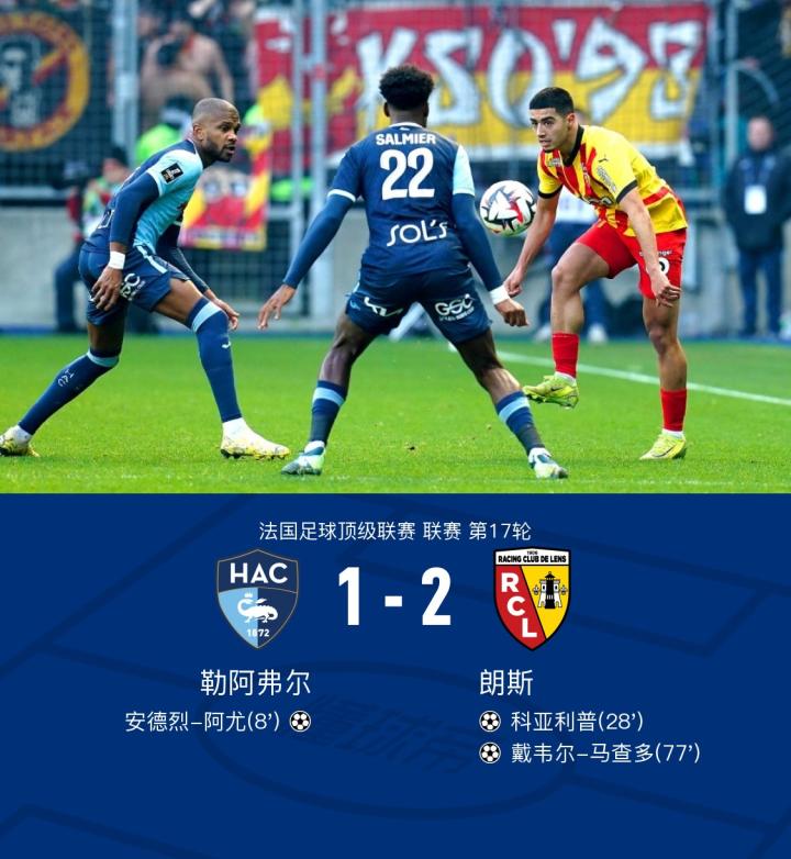 在法国足球顶级联赛第17轮的较量中,勒阿弗尔坐镇主场迎战朗斯。比赛中,勒阿弗尔的安德烈-阿尤率先为球队取得进球。随后,朗斯的科亚利普在索托卡的助攻下扳平比分。比赛接近尾声时,朗斯的戴韦尔-马查多在弗兰科夫斯基的助攻下打入制胜一球。最终,朗斯以2比1逆转战胜勒阿弗尔。